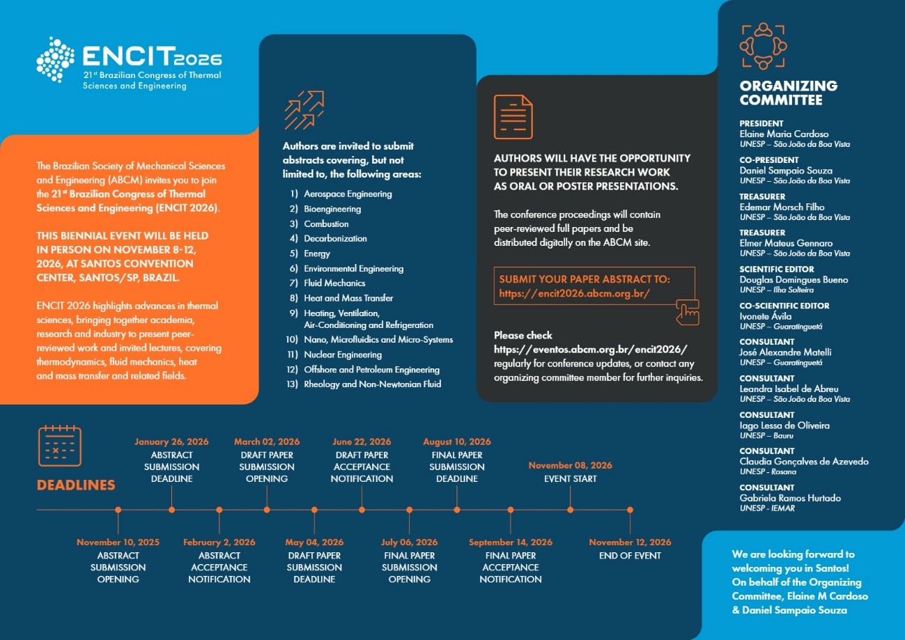 The Brazilian Society of Mechanical Sciences and Engineering (ABCM) cordially invites you to join the 21st Brazilian Congress of Thermal Sciences and Engineering (ENCIT 2026). This biennial event has established a rich tradition in exploring the cutting-edge of thermal sciences.