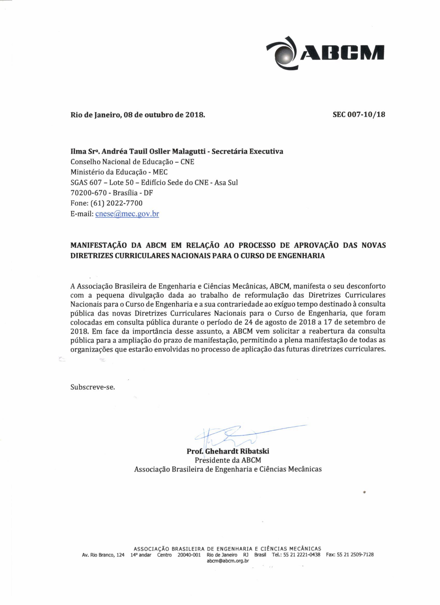 ABCM encaminha carta manifestando considerações ao processo de aprovação das novas Diretrizes Curriculares Nacionais para o Curso de Engenharia.