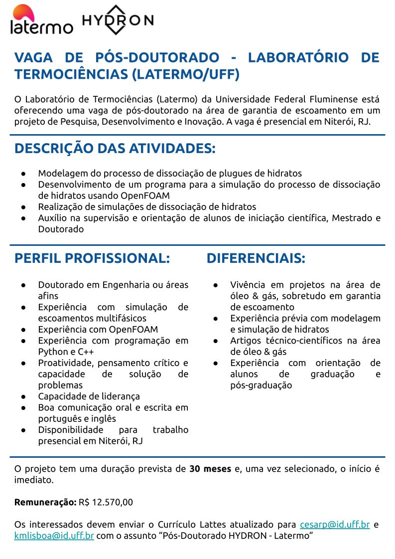 Vaga de pós-doutorado no projeto HYDRON do Laboratório de Termociências (Latermo) da UFFFonte: Prof. Kleber Lisboa (UFF)