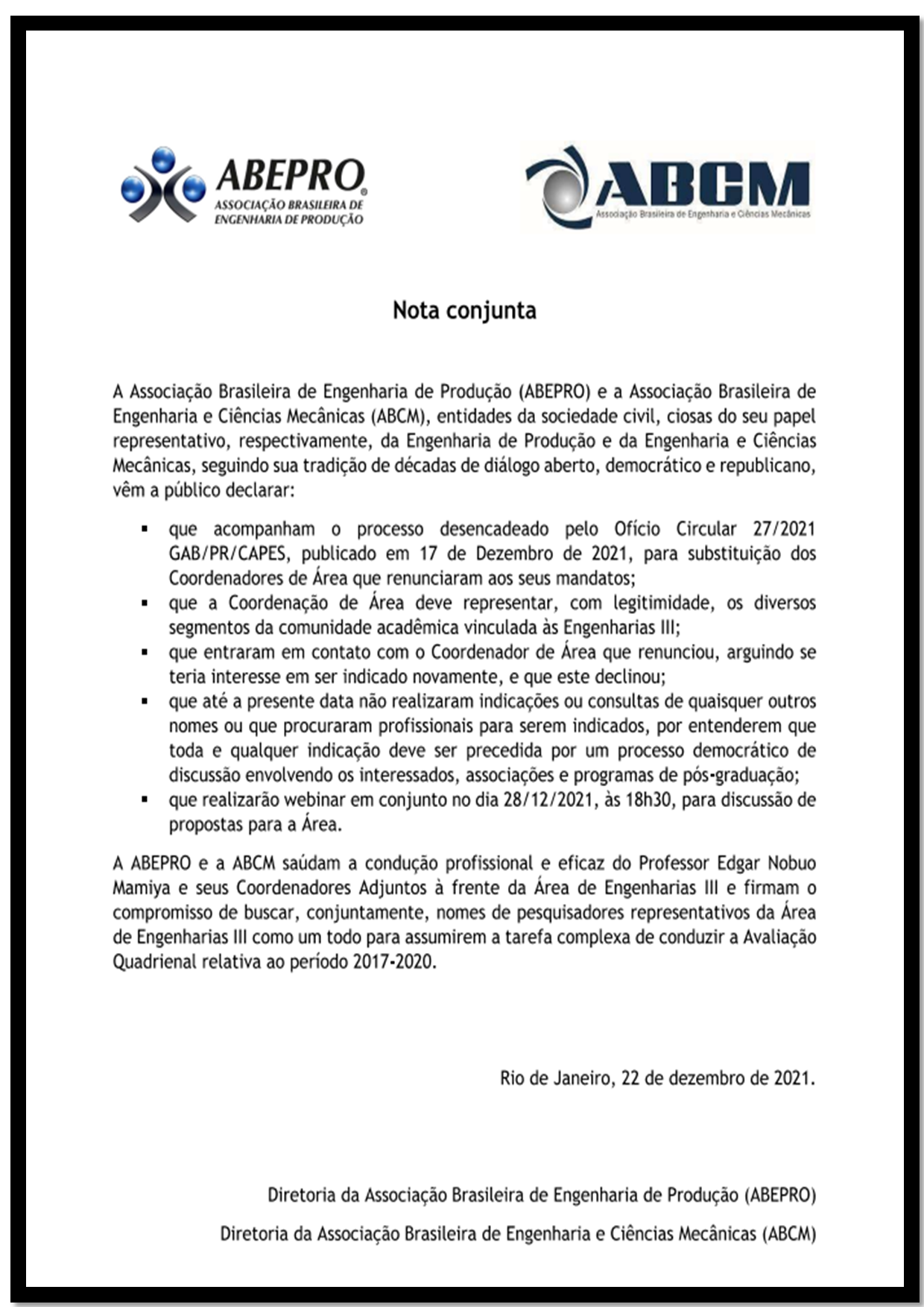 Nota Conjunta ABEPRO/ABCM sobre a substituição dos Coordenadores da Área de Engenharias III da CAPES