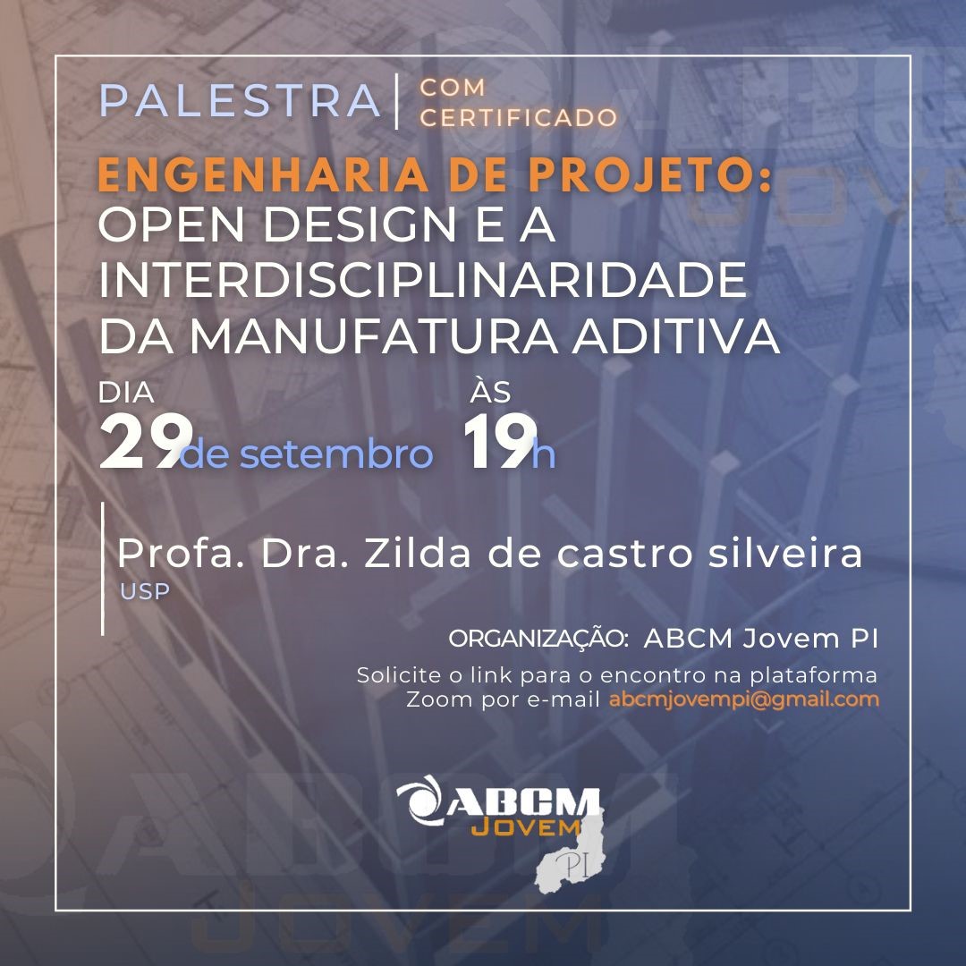 No dia 29 de setembro o núcleo piauiense da ABCM Jovem irá promover uma palestra com o com o tema "ENGENHARIA DE PROJETO: OPEN DESIGN E A INTERDISCIPLINARIDADE DA MANUFATURA ADITIVA". A palestra será ministrada pela Profª. Dra. Zilda de Castro Silveira, USP, no horário das 19h, o evento é gratuito e os participantes receberão certificado.