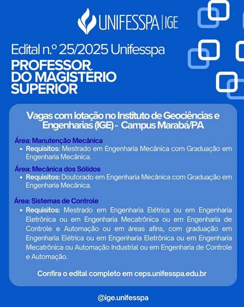 A Universidade Federal do Sul e Sudeste do Pará (Unifesspa) abre concurso para preenchimento de duas vagas para Professor Efetivo no curso de Engenharia Mecânica para atuar no Instituto de Geociências e Engenharias (IGE) em Marabá/PA.