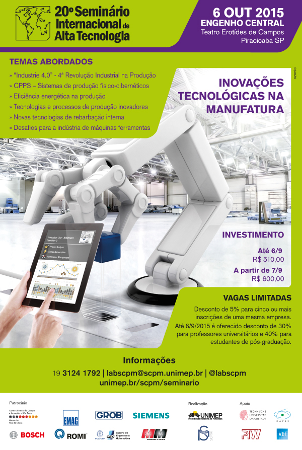 O Laboratório de Sistemas Computacionais para Projeto e Manufatura (SCPM), vinculado à Universidade Metodista de Piracicaba (UNIMEP), realizará no dia 6 de Outubro do corrente ano o 20º Seminário Internacional de Alta Tecnologia, sobre o tema “Inovações Tecnológicas da Manufatura”.