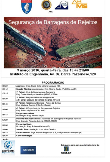Fonte: PUC-RIOA Segurança em Barragens de Rejeitos será tema de novo debate entre especialistas no dia 9 de março, no Instituto de Engenharia, em São Paulo. O evento gratuito, coordenado pelo Prof. Alberto Sayão, do Departamento de Engenharia Civil do Centro Técnico Científico da PUC-Rio, dá continuidade ao encontro realizado em dezembro, que reuniu mais de 200 participantes no Rio de Janeiro. Com apoio da ABMS e do Conselho Brasileiro de Barragens, o objetivo será discutir aspectos ambientais e acidentes, além da legislação sobre este tipo de construção. A presidente do Ibama, Marilene Ramos, participa do debate, que acontece das 15h às 21h, na Av. Dr. Pazzanese, 120, Vila Mariana. As inscrições estão abertas e devem ser feitas pelo e-mail divtec@ie.org.br.